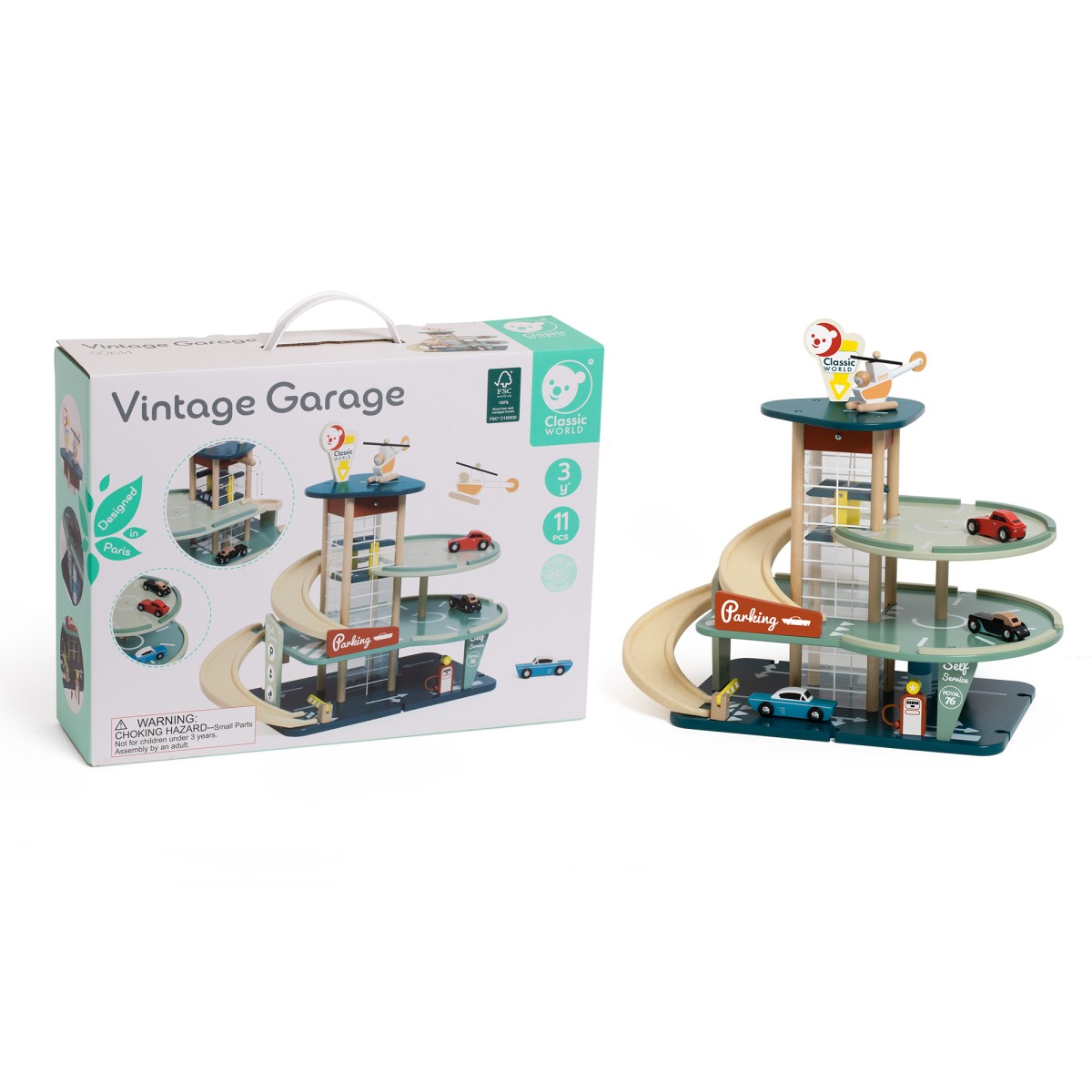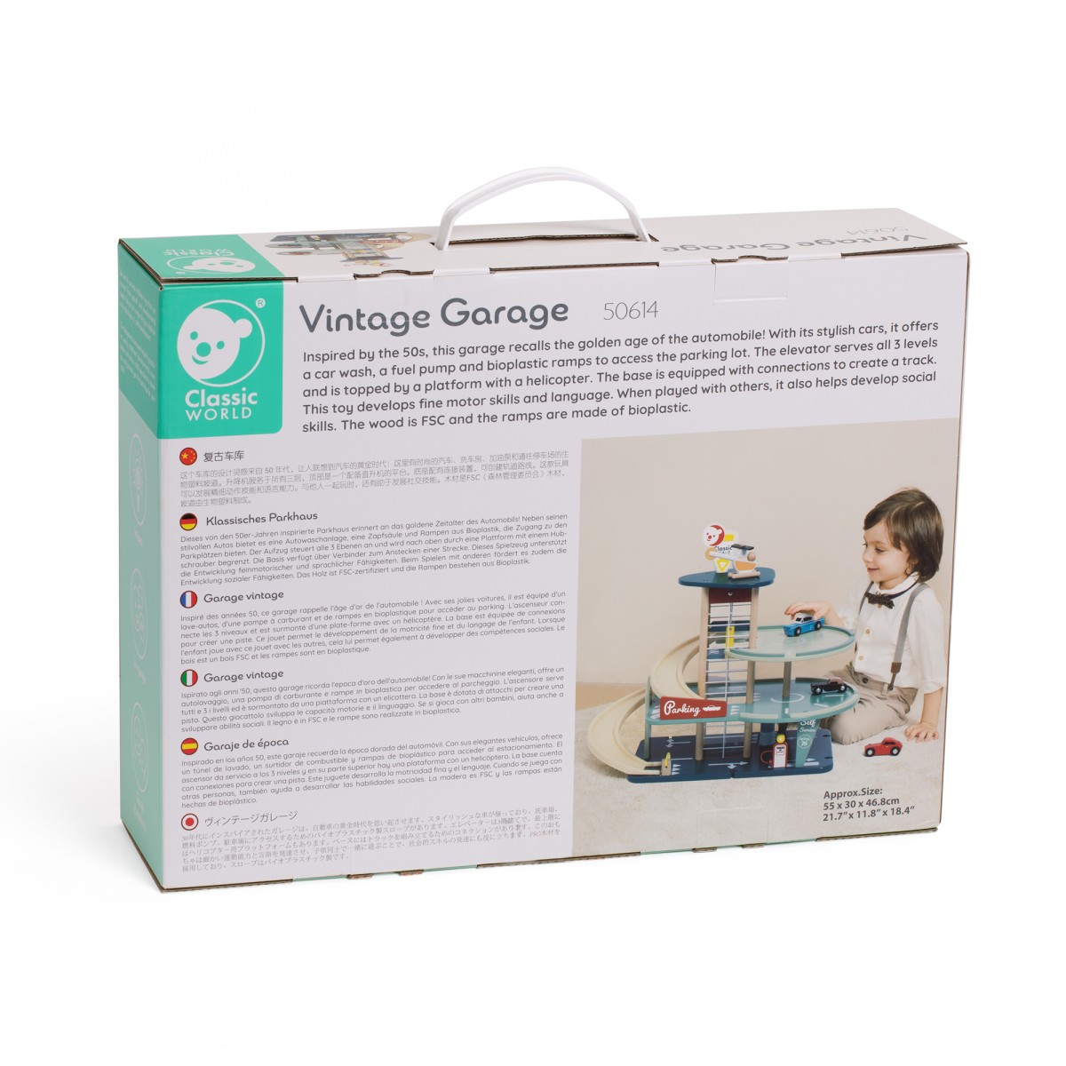 Εμπνευσμένο από τη δεκαετία του ’50, αυτό το Ξύλινο Vintage Γκαράζ μας ταξιδεύει στη χρυσή εποχή του αυτοκινήτου! Με κομψά αυτοκινητάκια, διαθέτει πλυντήριο αυτοκινήτων, αντλία καυσίμων και ράμπες από βιοπλαστικό για πρόσβαση στο πάρκινγκ. Ο ανελκυστήρας εξυπηρετεί και τα 3 επίπεδα και στην κορυφή υπάρχει πλατφόρμα με ελικόπτερο. Η βάση είναι εξοπλισμένη με συνδέσεις για τη δημιουργία πίστας. Το παιχνίδι αυτό βοηθά στην ανάπτυξη της λεπτής κινητικότητας και του λόγου, ενώ όταν παίζεται με άλλα παιδιά ενισχύει και τις κοινωνικές δεξιότητες.
