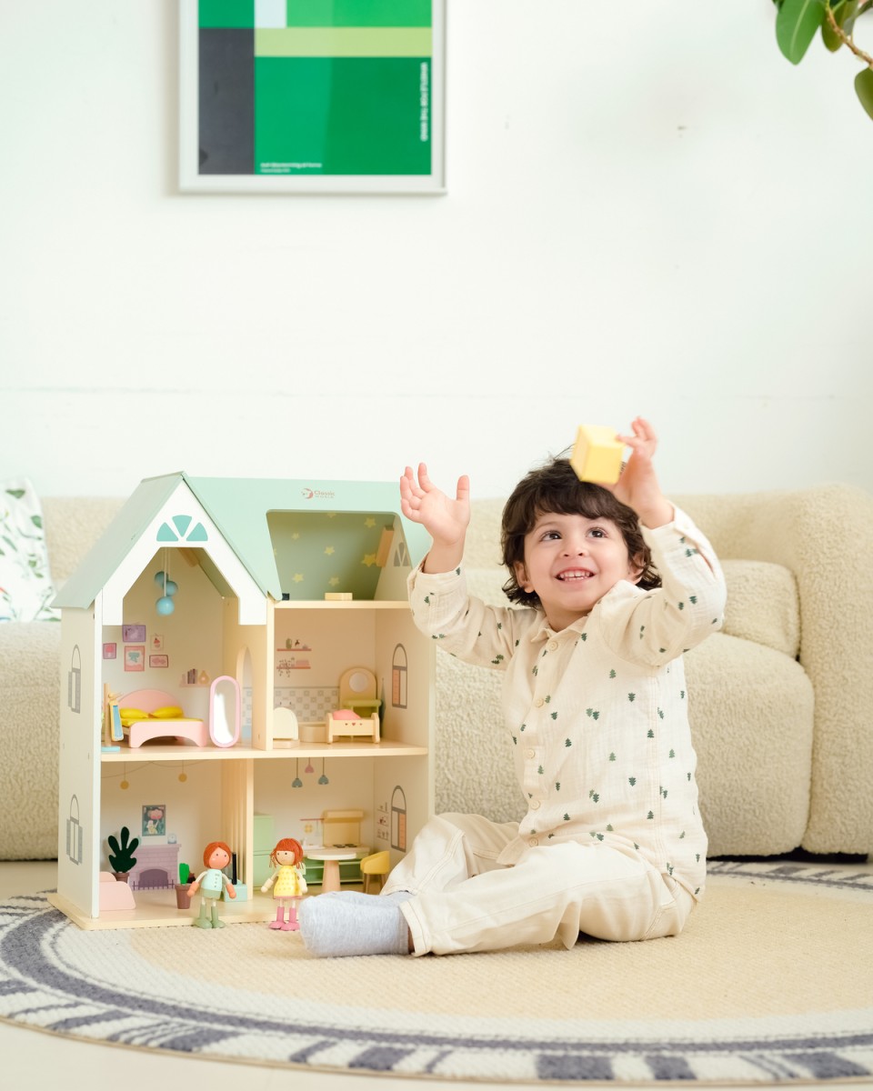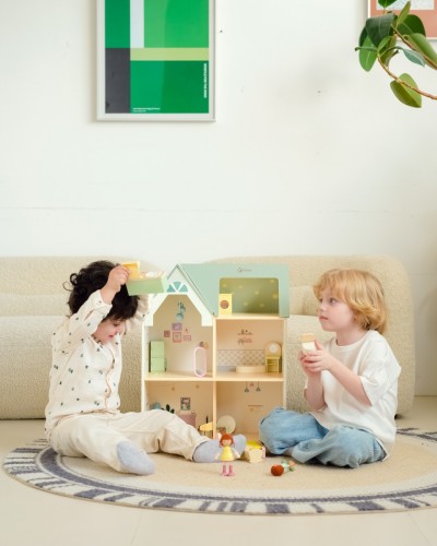 Τι υπέροχο Ξύλινο Σπίτι στην Εξοχή! Πρόκειται για ένα εντυπωσιακό διώροφο κουκλόσπιτο με πολλαπλά δωμάτια, πλήρως επιπλωμένο, που περιλαμβάνει σαλόνι, υπνοδωμάτιο, κουζίνα και μπάνιο, γεμάτα όμορφες σχεδιαστικές λεπτομέρειες. Η σοφίτα είναι διακοσμημένη με μοτίβα αστεριών, δημιουργώντας μια παραμυθένια ατμόσφαιρα. Δύο χαριτωμένες φιγούρες-κούκλες, καθώς και μια ασπρόμαυρη γάτα και ένας σκύλος, προσθέτουν ζωντάνια και ατελείωτες δυνατότητες παιχνιδιού. Τα παιδιά μπορούν να δημιουργήσουν τον δικό τους κόσμο και τις δικές τους ιστορίες μέσα σε αυτό το φανταστικό σπίτι.