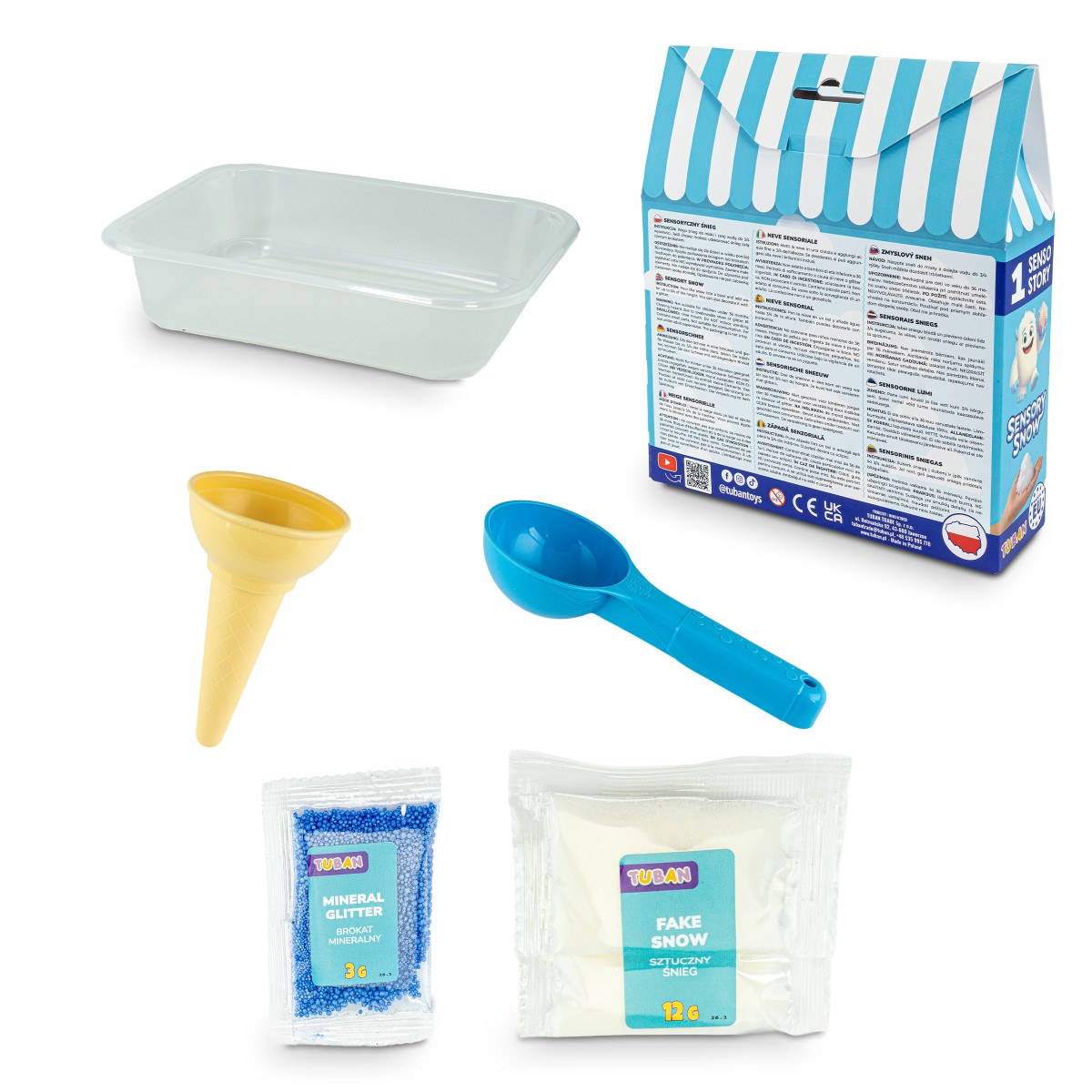 Αρχικά, το παιδί προετοιμάζει το δικό του αφράτο, απαλό στην αφή «χιόνι» και στη συνέχεια το χρησιμοποιεί για να δημιουργήσει «παγωμένα γλυκίσματα».