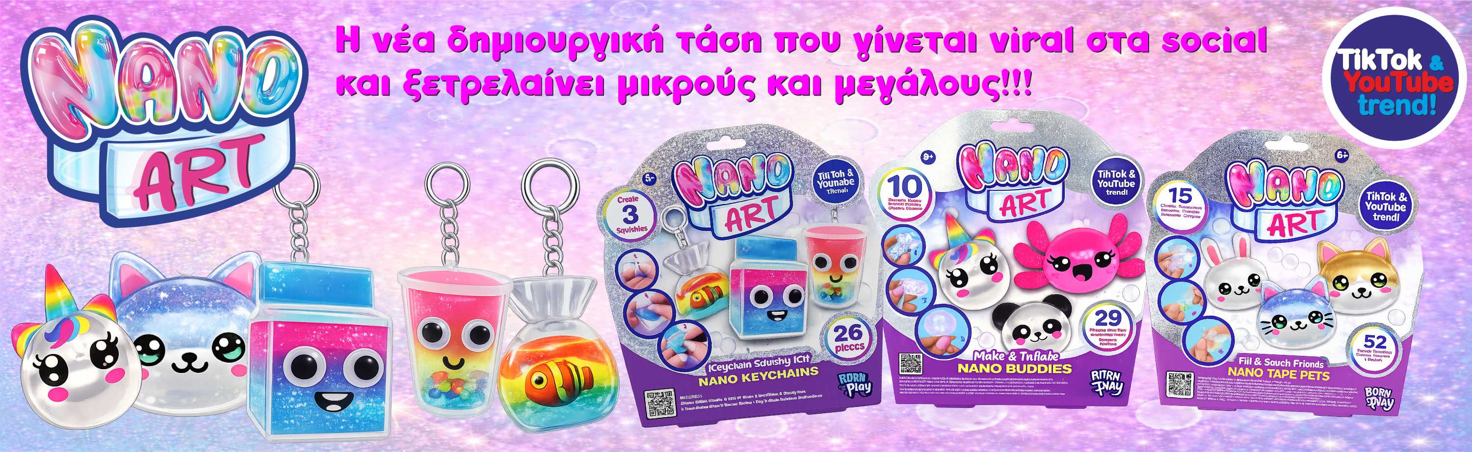 Το Nano Tape  είναι ένα σύγχρονο DIY παιχνίδι που έχει κερδίσει μικρούς και μεγάλους με την απλότητά του και το εντυπωσιακό αποτέλεσμα. Με βασικό υλικό τη διάφανη, ελαστική nano ταινία, τα παιδιά μπορούν να δημιουργήσουν squishy φούσκες, μπαλάκια και ζουληχτές κατασκευές που φουσκώνουν με αέρα και διακοσμούνται όπως ακριβώς τα φανταστούν. Η nano ταινία κόβεται, διπλώνεται και κολλάει εύκολα, επιτρέποντας τη δημιουργία μικρών φουσκών γεμάτων αέρα με ό,τι διακοσμητικά προτιμάς! Glitter, slime,…