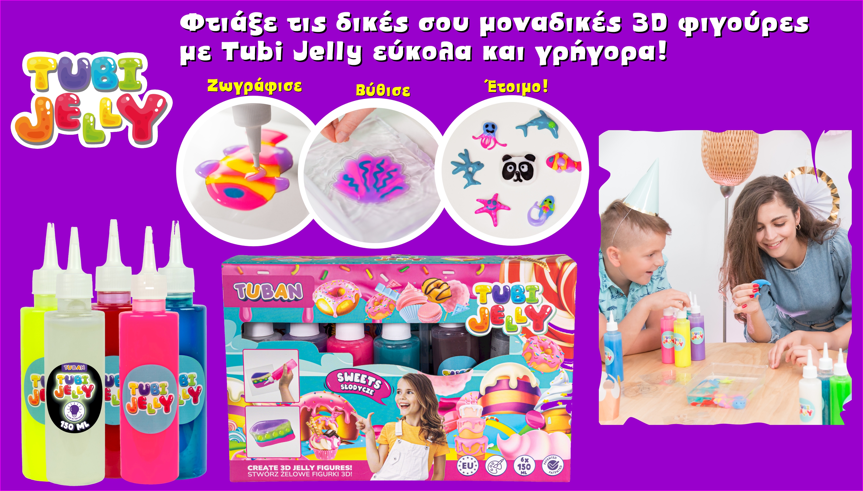 Τα Tubi Jelly συνδυάζουν DIY δραστηριότητα, sensory εμπειρία και το στοιχείο της “μαγείας” που ενθουσιάζει τα παιδιά από την πρώτη στιγμή. Είναι ιδανικά για δημιουργική απασχόληση στο σπίτι και αποτελούν μια εξαιρετική επιλογή για δώρο.