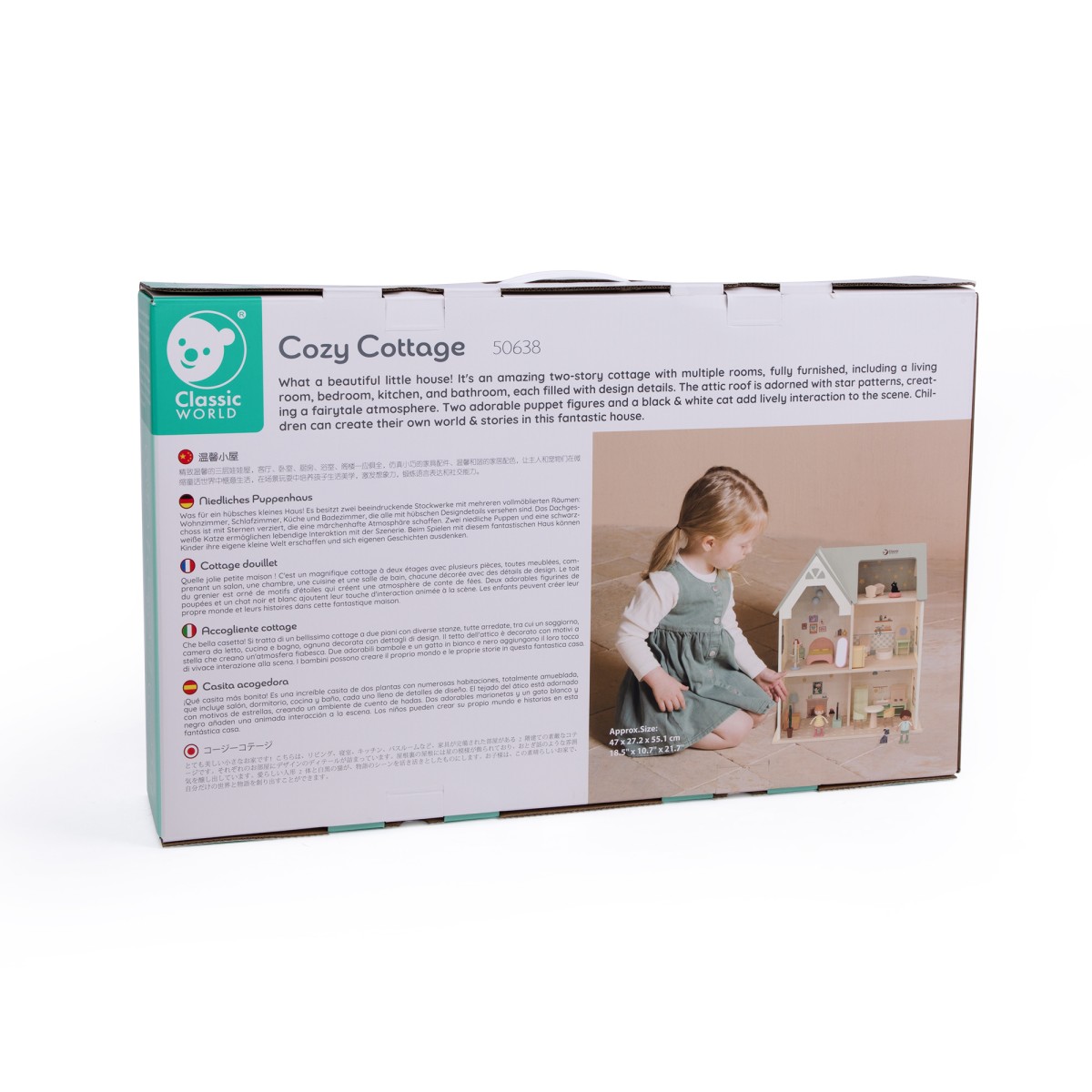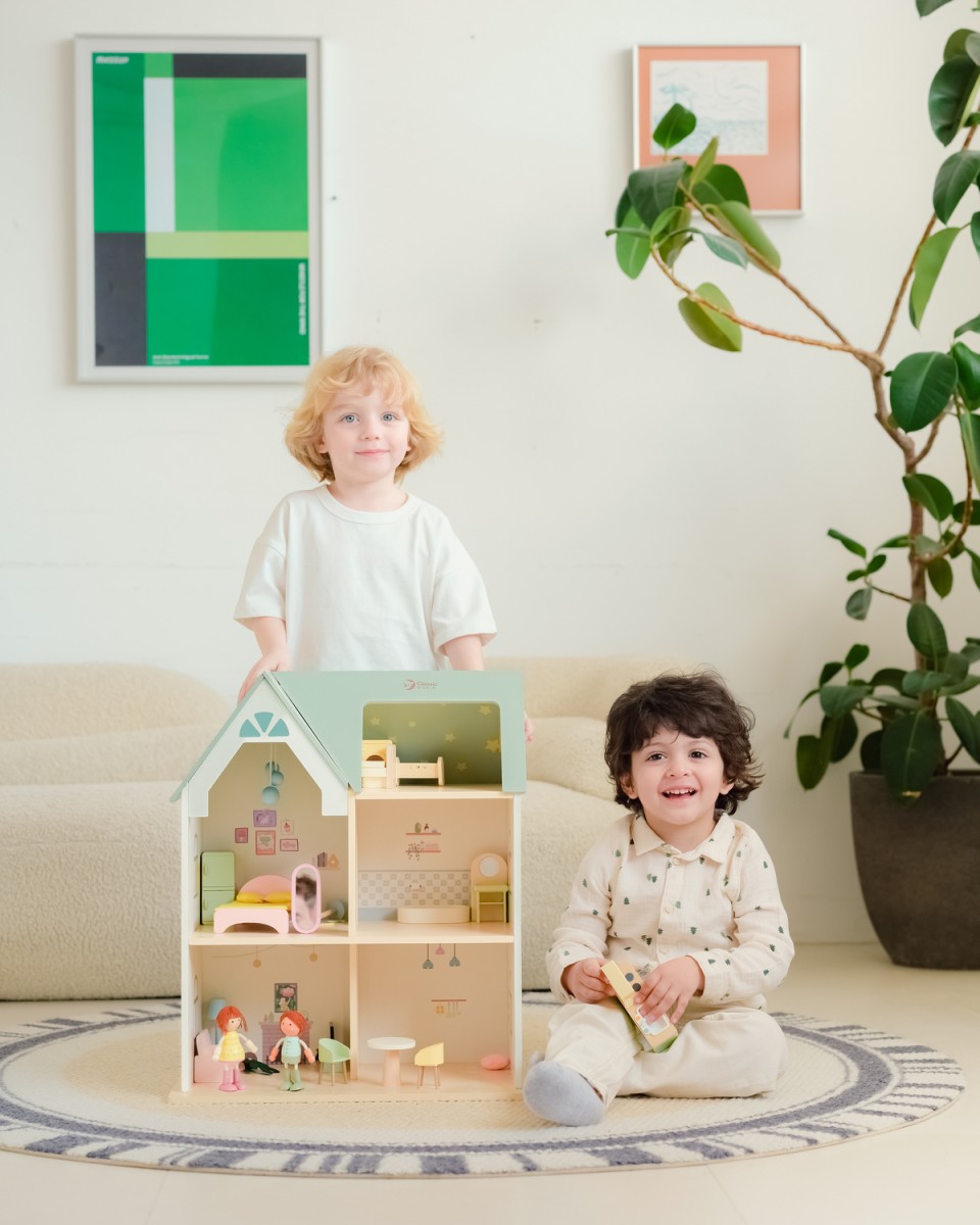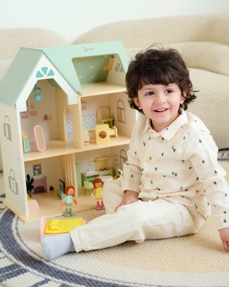 Τι υπέροχο Ξύλινο Σπίτι στην Εξοχή! Πρόκειται για ένα εντυπωσιακό διώροφο κουκλόσπιτο με πολλαπλά δωμάτια, πλήρως επιπλωμένο, που περιλαμβάνει σαλόνι, υπνοδωμάτιο, κουζίνα και μπάνιο, γεμάτα όμορφες σχεδιαστικές λεπτομέρειες. Η σοφίτα είναι διακοσμημένη με μοτίβα αστεριών, δημιουργώντας μια παραμυθένια ατμόσφαιρα. Δύο χαριτωμένες φιγούρες-κούκλες, καθώς και μια ασπρόμαυρη γάτα και ένας σκύλος, προσθέτουν ζωντάνια και ατελείωτες δυνατότητες παιχνιδιού. Τα παιδιά μπορούν να δημιουργήσουν τον δικό τους κόσμο και τις δικές τους ιστορίες μέσα σε αυτό το φανταστικό σπίτι.